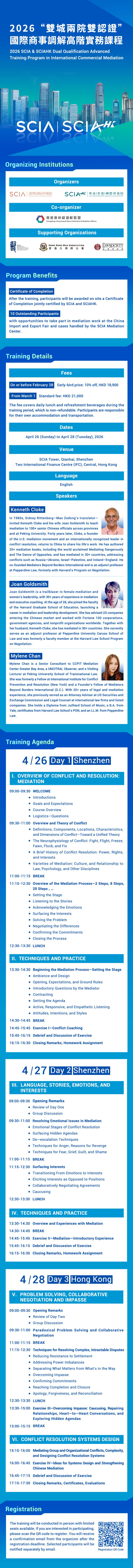 華南(香港)國際仲裁院(SCIAHK)與深圳國際仲裁院(SCIA)將於2026年4月26日— 4月28日聯合開辦為期三天的2026"雙城兩院雙認證"國際商事調解高階實務培訓課程(2026 SCIA & SCIAHK Dual Qualification Advanced Training Program in International Commercial Mediation)。該課程使用英語教學,聚焦國際商事調解中的語言、情緒、利益衡量等多方面技巧,由國際爭議解決領域的業界賢達Kenneth Cloke領銜傳授調解的全流程經驗,透過由淺入深的理論講解、生動有趣的角色扮演等豐富的課程安排,為有志於從事國際商事調解業務的專業人士提供全面指導。