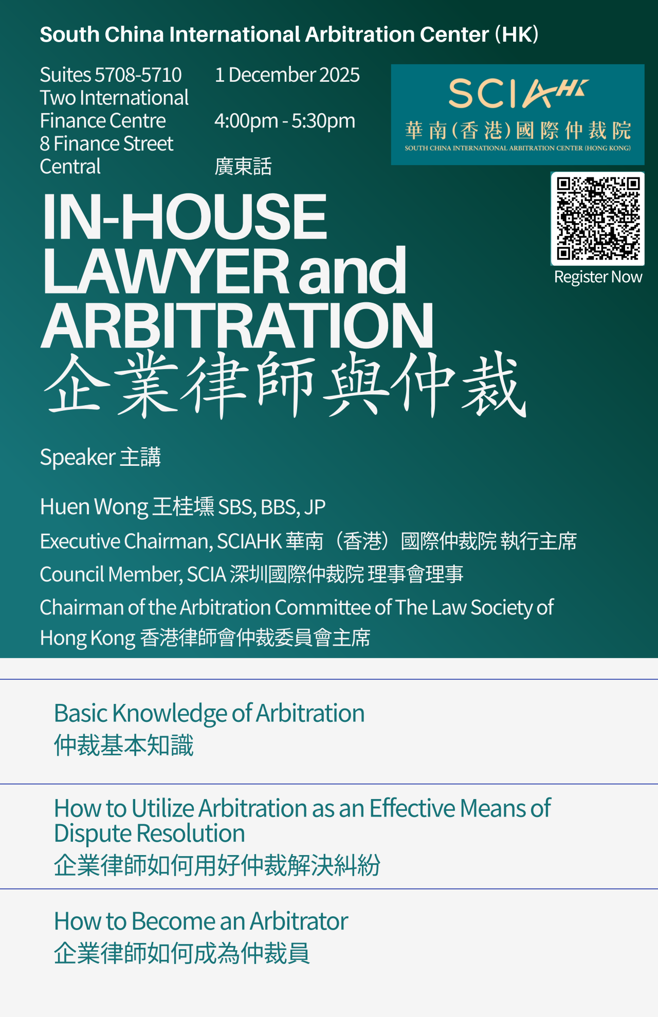 华南(香港)国际仲裁院将于2025年12月1日举办“企业律师与仲裁”的分享会。本次分享会由华南(香港)国际仲裁院执行主席、深圳国际仲裁院理事会理事、香港律师会仲裁委员会主席王桂壎先生担任主讲,面向企业律师,分享有关仲裁的基本知识、企业律师如何用好仲裁解决纠纷以及企业律师如何成为仲裁员等议题。诚挚邀请各位企业律师的参与。