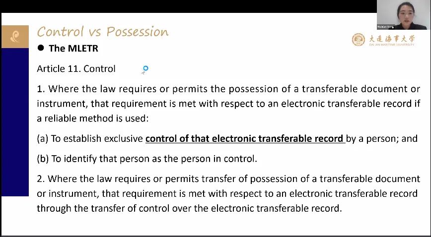 主题发言环节,大连海事大学特聘「兴海」教授宋美娴,中山大学法学院助理研究员、香港大学访问学者王柳分别围绕「以单证控制为焦点发展电子运输单证法律框架」区块链电子提单及其数据保护规制」进行了分享发言。